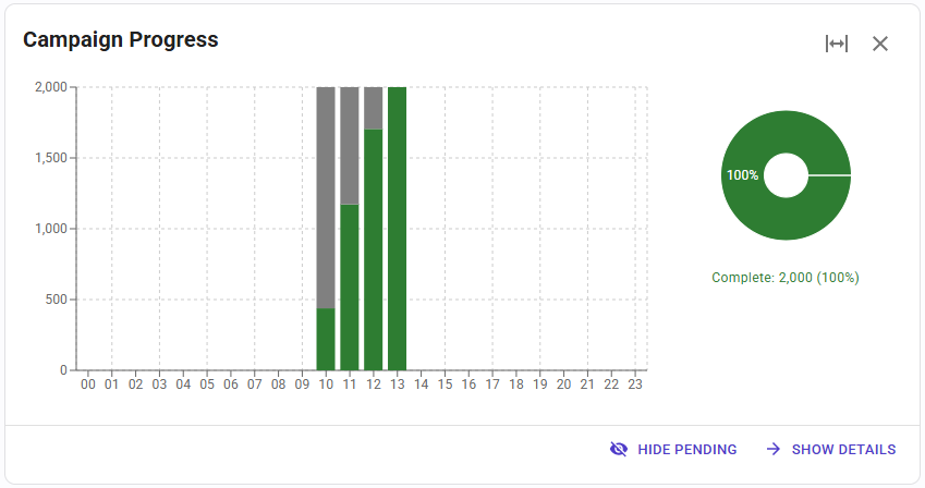 This report provides summarized information for different metrics, allowing users to analyze the campaign overall results. Users can customize the charts layout, select which charts to show, how to group the results, and the date range to analyze.