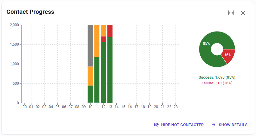 In the bar chart users can see the evolution of these contact attempts. In the pie chart, users can see the final distribution of the campaign progress when the report time frame ends.