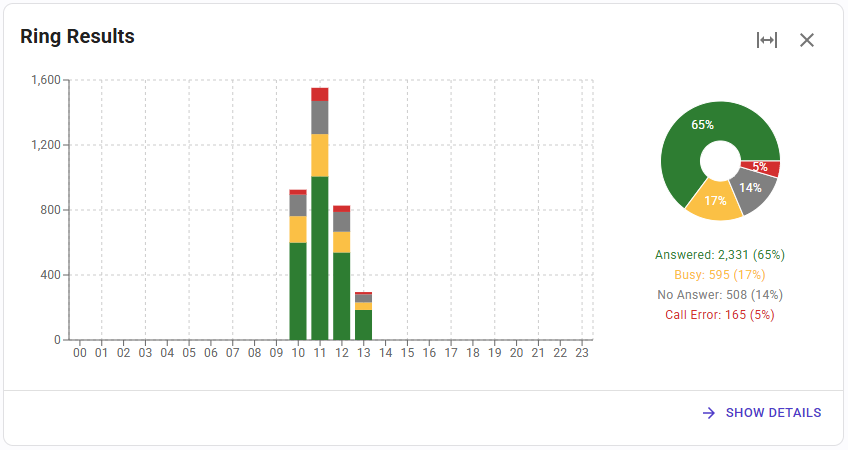 This card is only shown for progressive dialer campaigns, and shows the result for all the call attempts to the external numbers during the selected time frame. Each call will have one of the following ring results: