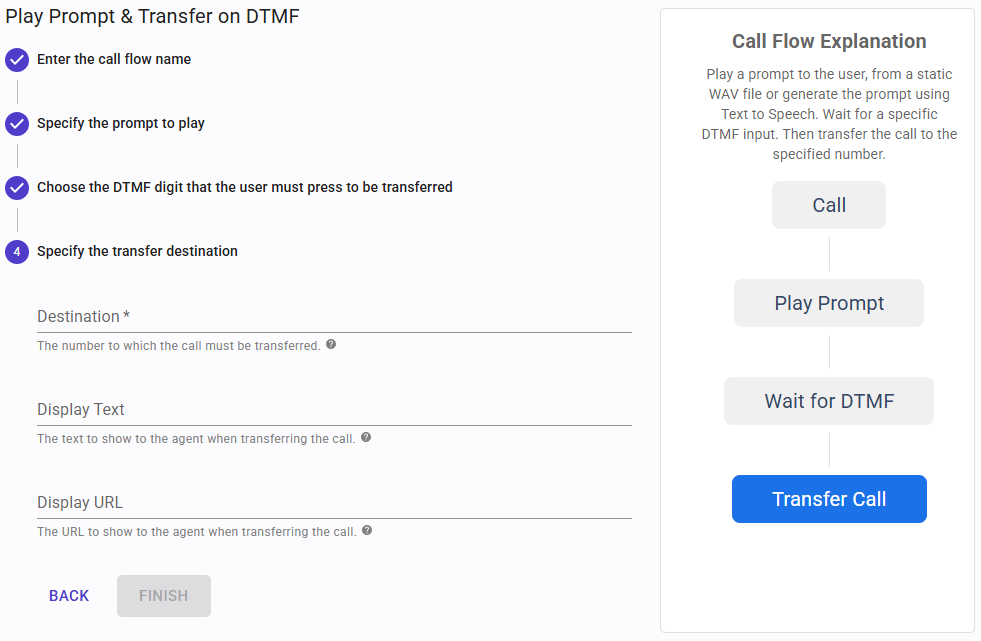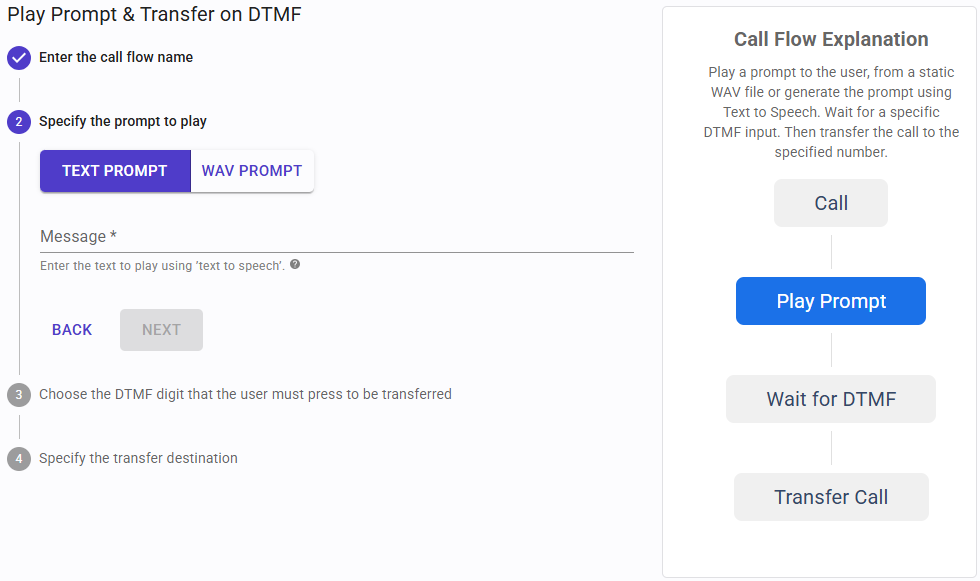 Esta plantilla permite crear un flujo de llamadas que reproducirá un único mensaje y luego transferirá la llamada al destino especificado cuando el usuario presione una tecla DTMF específica. El mensaje que se reproducirá puede ser un mensaje de texto, en el que el audio se genera automáticamente mediante texto a voz, o un mensaje WAV, en el que se carga el archivo WAV para reproducirlo.