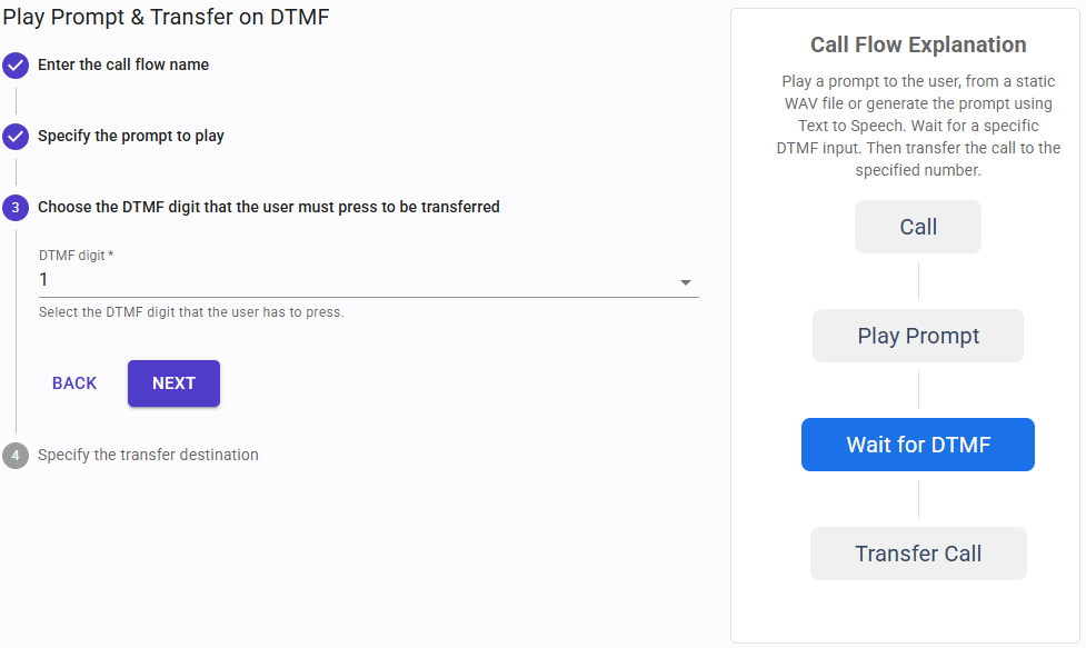 Selecciona qué dígito DTMF debe presionar el usuario para poder transferir la llamada. Si el usuario presiona un dígito diferente o ningún dígito, se reproducirá nuevamente el mensaje anterior. El usuario tiene 3 intentos para ingresarlo; de lo contrario, se cortará la llamada.